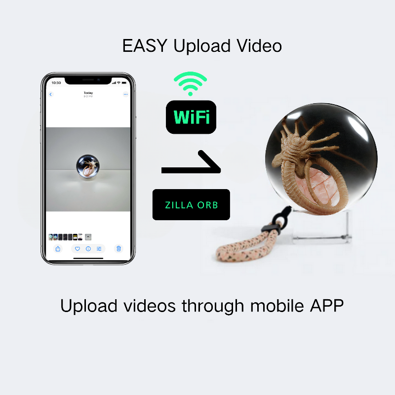 Just connect your mobile and ZillaOrb™ by wifi and upload videos or pictures through the mobile APP. Very simple!